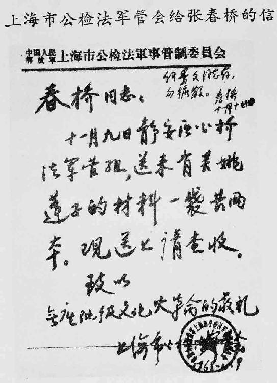 ■ 上海市公检法军管会关于姚蓬子材料给张春桥的请示信