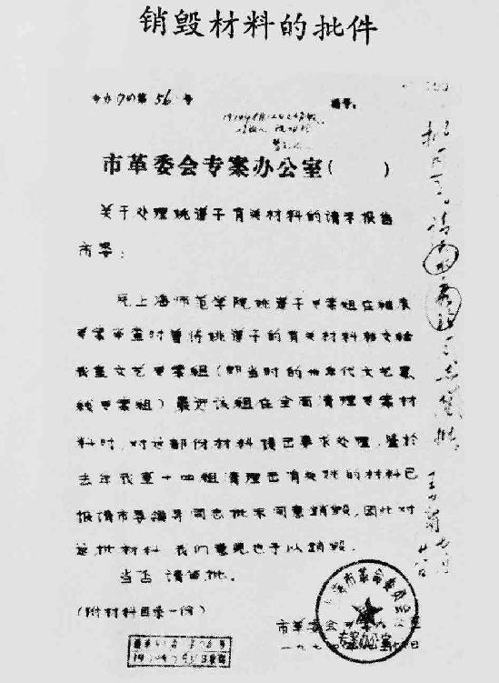 原上海师范学院姚蓬子专案组在结束专案审查时曾将姚蓬子的有关材料移交给我室文艺专案组(即当时的30年代文艺黑线专案组——引者注),最近该组在全面清理专案材料时,对这部分材料提出要求处理,鉴于去年我室十四组清理出有关姚的材料已报请市委领导同志批示同意销毁,因此对这批材料,我们意见也予以销毁。
