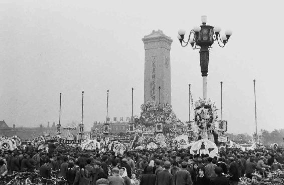 清明节——农历三月初五,阳历4月4日,正值星期天,涌向天安门广场的人们达200万人次!一个又一个白色花圈,郑重地放在人民英雄纪念碑前,无限哀思,一片深情,献给离世三个月的周恩来总理。据统计,从3月19日北京朝阳区牛坊小学的红小兵在纪念碑前献上第一个花圈,至4月4日深夜,共有1400多个单位献上了2073个花圈!