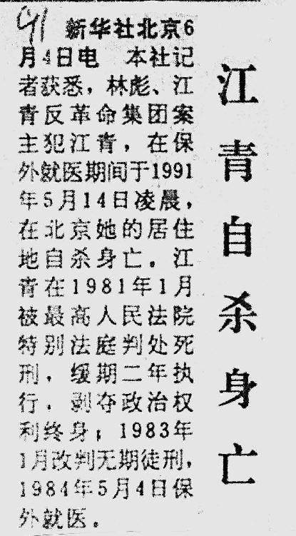 江青自杀当然应该成为一条新闻,布告天下咸知这个十年灾难的祸首终于恶贯满盈,下地狱去了。