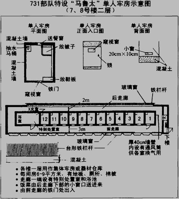 原部队人员提供的证词是生动的。综合原部队人员所谈的情况,关押在7号楼、8号楼内的“马鲁太”总数,最多经常有80人至100人左右。每栋楼平时40人,多时50人。在这里就产生了一个疑问:据被告人川岛在审判731部队的哈巴罗夫斯克军事法庭上做出的证词,“马鲁太”的关押人数经常保持在二三百人,如果7号、8号楼的实际关押能力为八十人至一百人的话,那么,岂不是同哈巴罗夫斯克军事法庭上说的二三百人有很大的“差距”吗?在731部队里,除特设监狱外,是否还有别的收容所呢?关于这一疑问,后来,也有人证言在特设监狱有地下室。是否属实,未曾证实。