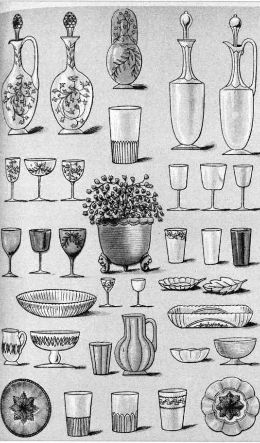 正式宴席的餐桌:玻璃器皿包括饮料瓶、葡萄酒壶和一个卡拉夫瓶(引自比顿夫人的《家政管理手册》)