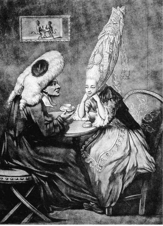 与此同时,可以不加夸张地说,妇女把戴假发提高到了另一个水平——把头发集结在一个名叫发栅或高头饰的铁丝架上。她们把涂上油脂的羊毛和马鬃与自己的头发混在一起,使发卷达到极高的高度。女性的假发有时候高达2英尺半,使得戴假发的女子的平均身高达到差不多7英尺半。她们出门去约会时,常常坐在自己马车的地板上,或者把脑袋伸出车窗外去。至少有两起死亡事故要归因于妇女的头发,她们的头发碰到吊灯,着了火。