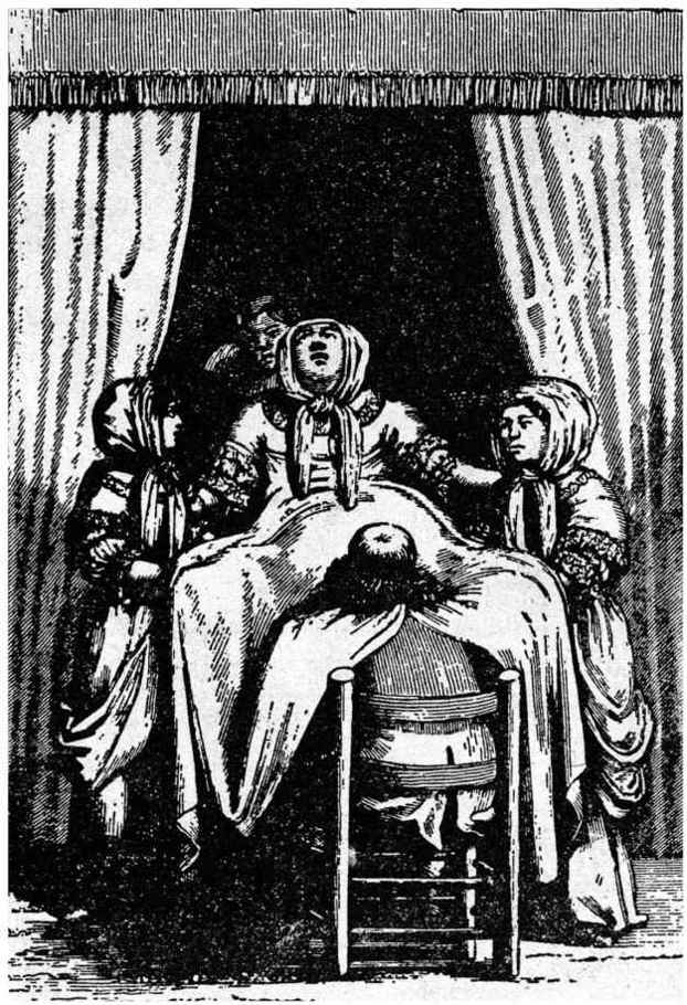 18世纪一名妇女在分娩(注意:为了保持庄重,医生把床单围到脖子跟前)
