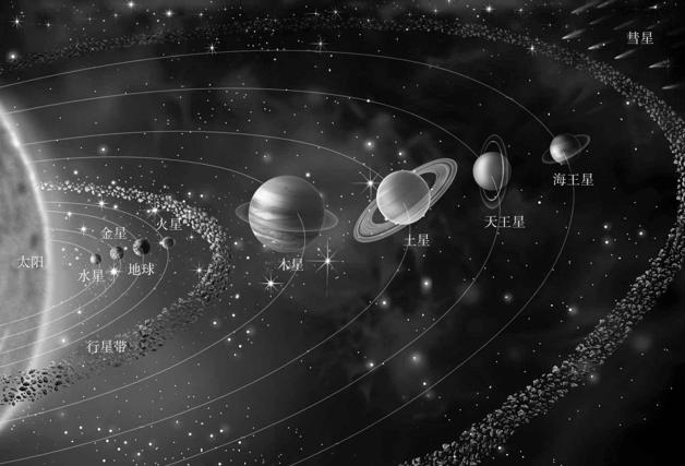 行星系的构成:四个类地行星,即水星、金星、地球和火星;外层四大行星,即木星、土星、天王星和海王星;以及其他较小天体,如卫星以及无数颗小行星(参见图 2.4)。