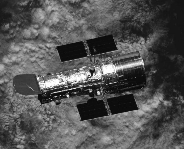 在所有的轨道望远镜中,最突出的是美国航空航天局(NASA)的哈勃太空望远镜(HST),它于 1990 年 4 月 25 日由一架航天飞机送上太空,大小与一辆校车相当,每 97 分钟绕地球旋转一周。然而,在发射成功后数日内,哈勃太空望远镜传回地面的图像非常模糊。美国航空航天局的科学家很快找出了原因——主镜出现了一个主要失误,它的一条边不平,偏差是人类一根头发宽度的 1/50!1993 年,“奋进号”太空飞船追上哈勃太空望远镜,增加一架照相机来修正镜面出现的问题。1997 年 2 月,哈勃太空望远镜得到第二次维修,上面安装了红外线摄谱仪(参见图 2.1)。当在地球大气层之外运行时,它记录了超清晰的图像,我们的太空知识也彻底改观。哈勃太空望远镜向天文学家传回的图像,能够达到 0.1 弧秒分辨率(1 弧秒是 1 度的微小部分,是测量分辨率的标准单位)。科学家相信,在未来几十年,巨大的轨道干涉仪可以将分辨率精确到十亿分之一弧秒。