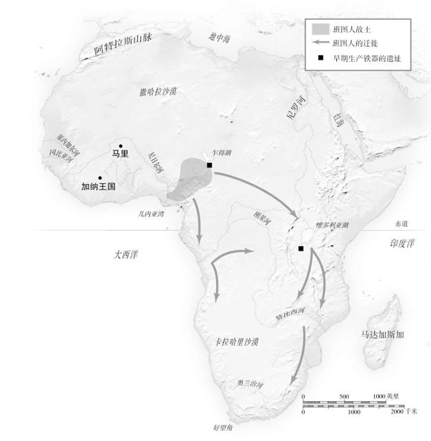 第 5 章已经提到,随着班图人从现在尼日利亚东部和喀麦隆南部向非洲其他地区的移民,农业缓慢地传播到整个撒哈拉以南非洲。班图人种植薯蓣和油椰子,后来又种植粟和高粱,另外,他们也牧牛。大约公元前 1000 年,他们掌握了制造铁器工具和武器的技术。到公元前最后几个世纪,除了稠密的森林和沙漠地区之外,农业遍布整个撒哈拉以南非洲。在森林地带,巴特瓦人(Batwa people)——通常被称为俾格米人(Pygmies)——是丛林专家,他们以丛林产品与班图人进行贸易(参见地图 6.7)。