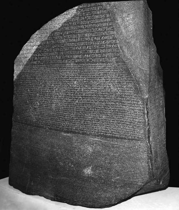 罗塞塔石碑是一块不规整的玄武岩石头,1799 年,拿破仑的士兵在亚历山大附近的城镇罗塞塔(今日的拉希德)发现了它。碑文是由祭司起草的诏令,旨在确认对年方 13 岁的托勒密五世的崇拜。碑文以象形文字、世俗体和希腊文刻写,从而使得商博良能够解读象形文字。石碑目前保存在大英博物馆
