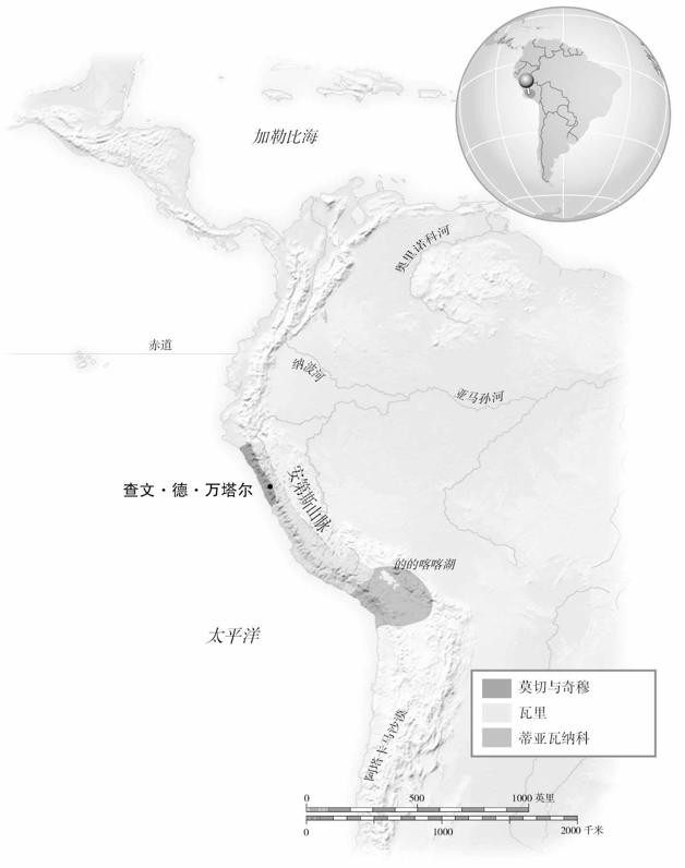安第斯山区独特的地理,是该地区一切文明实验的主要挑战。太平洋底部纳斯卡板块向东移动,俯冲于南美板块之下,由此创造了两条平行的南北走向山脉,它们离太平洋海岸只有 96 千米(参见地图 6.6)。山脉高达 6705 米,它们阻挡东风抵达这片狭窄的海岸区,在大部分时间里,这块地区都是沙漠,年降雨量大约为 50 毫米,而且基本上来自雾气。大山东部是热带雨林,从海岸到雨林开始的地方,存在各种小气候。由于板块活动,那里时常发生地震。另外,人们还面临海洋表面温度的冷暖交替,即现在所说的厄尔尼诺/拉尼娜现象,它们会导致暴雨,杀死鱼类或改变鱼类的供应。