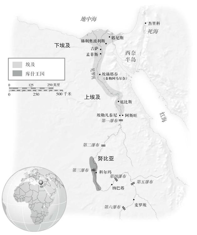 随着气候变得更干燥,撒哈拉地区变成了沙漠,人和动物被迫迁徙,要么南下进入乍得湖周围,要么前往尼罗河流域(尼罗河发源于维多利亚湖,自南向北注入地中海)。尼罗河流域出现了两个繁荣的地区,它们之间被六大瀑布或者说无法航行的激流和瀑布所阻隔(参见地图 6.2)。一个地区被称为埃及,从地中海绵延 700 英里抵达阿斯旺附近的第一瀑布;另一个地区从第一瀑布延伸到第六瀑布,包括今天苏丹北部。它在公元 4 世纪之后被称为努比亚;此前被称为库什(Kush)。