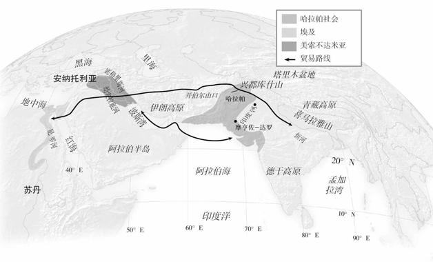 沿着通往中亚的路线进行的贸易,是最笨重的,中国人从中亚获得珍贵的玉石。大约公元前 2000 年,中亚出现了许多贸易城市,这就是阿克瑟斯文明(Oxus culture),它与苏美尔、中国和印度北部都有联系,也与亚洲内陆的游牧民族有来往。我们可以把这种相互联系(当时已经是公元前 2000 年)称为非洲-亚欧大陆世界体系吗,换言之,可以称之为一种由资本积累所推动的、系统地联系在一起的交往网络吗?史学家在这个问题上争论不已。