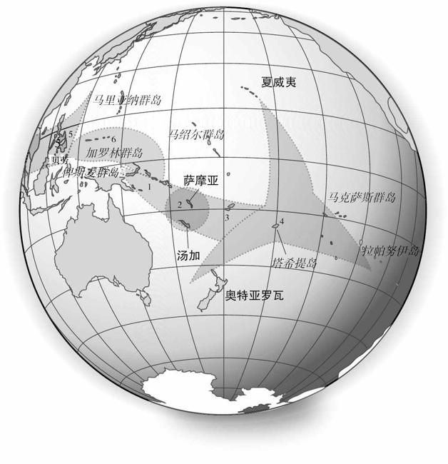 旧石器时代开始的全球殖民进程,结束于人类对太平洋许多小型和不那么小的岛屿的拓殖。太平洋地区经历了两次大型移民潮。第一次出现在旧石器时代晚期,或许可以看做拓殖萨胡尔(Sahul)的移民潮的组成部分。萨胡尔是一块冰川时代的大陆,包括新巴布亚几内亚、塔斯马尼亚和澳大利亚,它们构成澳大拉西亚世界区。人类在开拓澳大利亚不久,就到达了菲律宾和西美拉尼西亚群岛,包括俾斯麦群岛和所罗门群岛(有时候被称为“大洋洲附近”)。他们使用的或许是相似的航海技术。现代人类在 4000 年前就到了所罗门群岛。不过,对太平洋的探索被延缓了好几千年,原因或许在于,向更远处航行所需要的航海技术,直到新石器时代革命之后才发展出来(参见地图 9.5)。