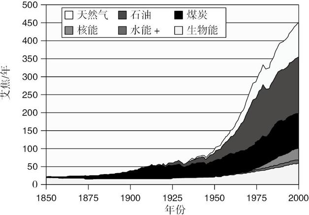 图 10.1 世界能源消费,1850 年到 2000 年。