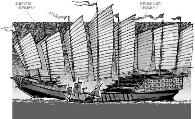 图 10.3 郑和的宝船(长 120 米)与哥伦布的尼娜号(Nina)小船。