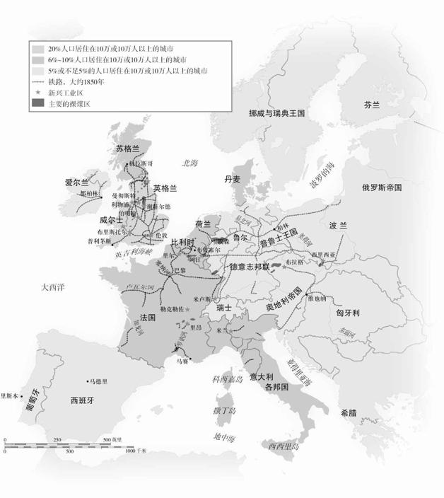 在 1871 年统一前,德意志地区不是一个国家。统一前,独立的邦国自行征集货物的关税,这种情况一直持续到 1830 年关税同盟的成立。到 19 世纪 40 年代,德国各邦国才完全废除农奴制。因此,德意志地区的工业革命比法国稍晚,以铁、钢、煤炭和化学工业为主。在政府的大力参与下,铁路网络在 19 世纪 50 年代得以修建。大型公司或垄断企业(卡特尔)控制各个部门,这与英国和法国有很大不同。1830 年到 1840 年间,德意志地区煤炭产量翻了一番;1840 年到 1870 年间,又增长了 7 倍(参见地图 11.1)。