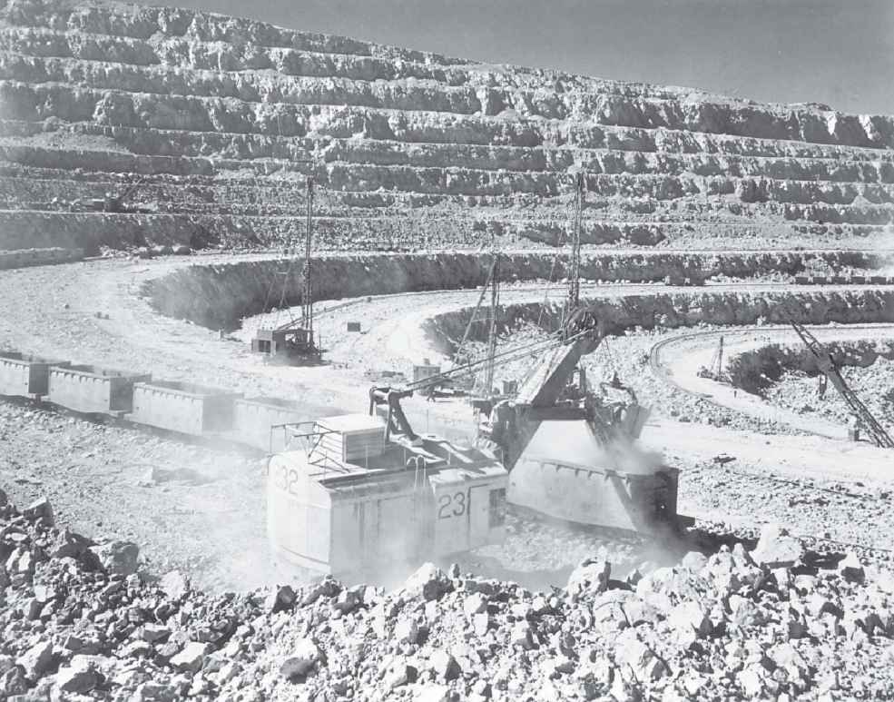 化石燃料时代的采矿行为,快速且彻底地重整了地球的景观。图为1944年智利丘基卡马塔(Chuquicamata)铜矿开采时的情形。20世纪中期,铜是世界上最重要的原材料之一,主要是因为铜可用来制造电线。由于产业与家庭转为用电,全球各地类似的矿场变得相当忙碌,从日本、新喀里多尼亚、津巴布韦到美国犹他州皆然。1980年后无线通信与光纤电缆使铜的需求降低,全球多处铜矿因此关闭