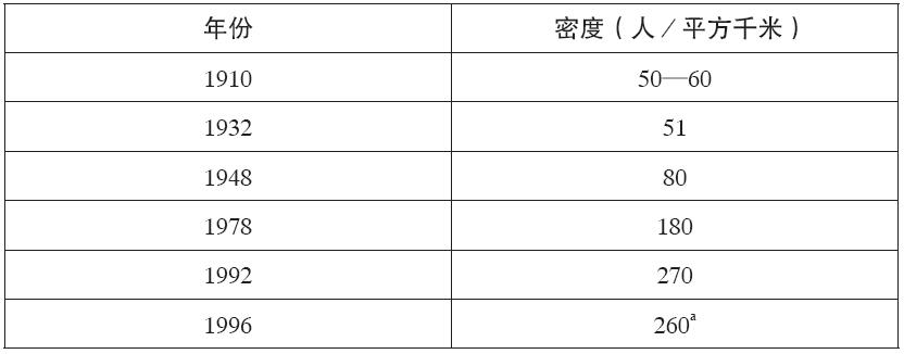 表1.3 1910—1996年卢旺达人口密度