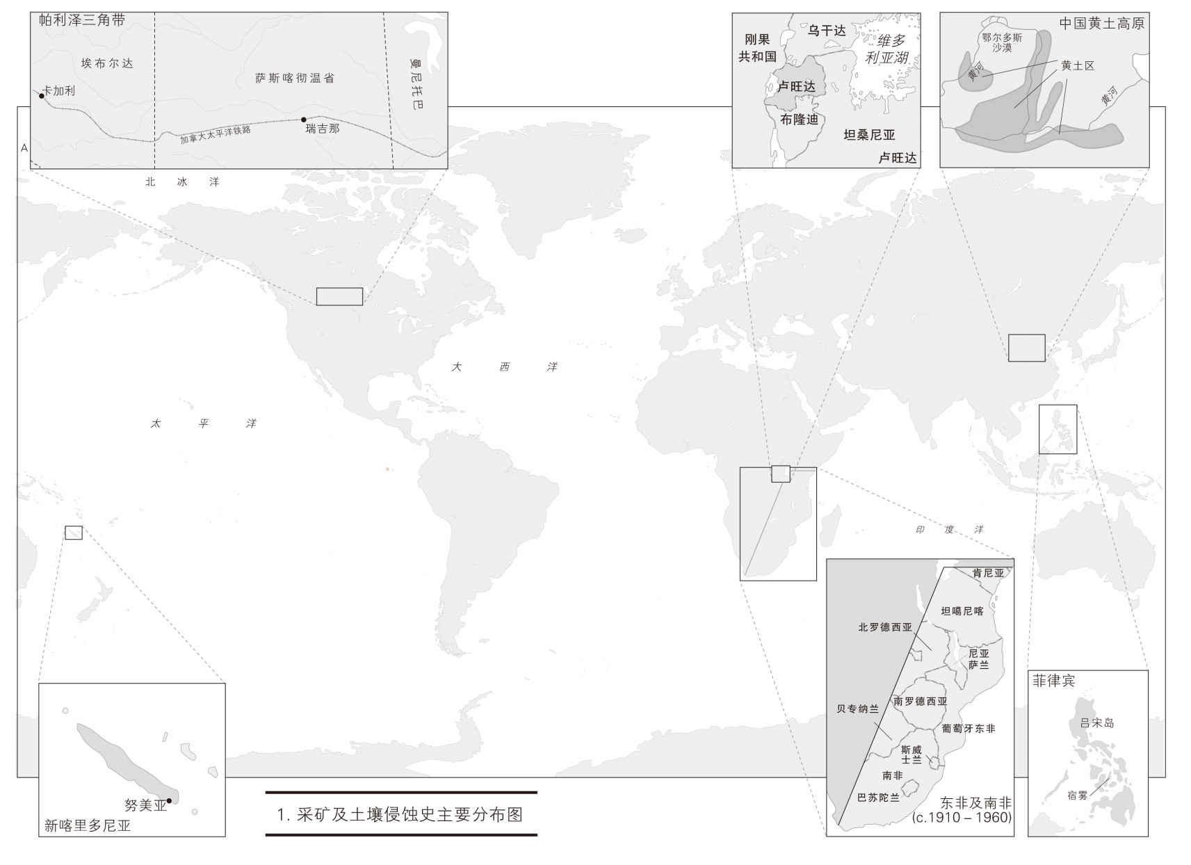 新喀里多尼亚开采镍矿的历史,是改变地球岩石圈后造成环境退化与社会瓦解的一个极端案例。如果矿区位于法国本土,情况可能大不相同。但1880年后帝国主义与工业化盛行,全球有越来越多的采矿活动选在限制较少且执法不彰的地区进行。美拉尼西亚其他大型矿区也发生类似事件:(1960年后)巴布亚新几内亚的布干维尔(Bougainville)潘古纳(Panguna)矿区,(1980年后)新几内亚的奥克泰迪矿区(Ok Tedi),以及(1980年后)伊利安查亚(Irian Jaya)自由港(Freeport)矿区。[26]类似新喀里多尼亚的例子,还发生在智利、澳大利亚、赞比亚、西伯利亚、美国犹他州等地。[27]