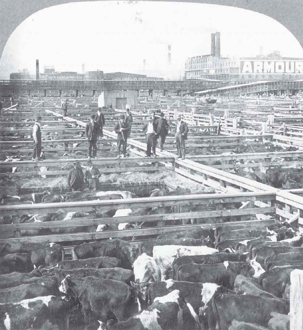 图为1909年左右芝加哥围栏场牛群聚集等待屠宰的景象。1865年当地将围栏与屠宰场集中在同一地点,产生的废弃物与内脏造成了特别的污染问题。芝加哥河南部支流将围栏的废弃物带入密歇根湖,直到1900年芝加哥人改变河的流向并将污水导入密西西比河。菲利普·阿穆尔(Philip Armour)便拥有其中一座大型肉类加工厂