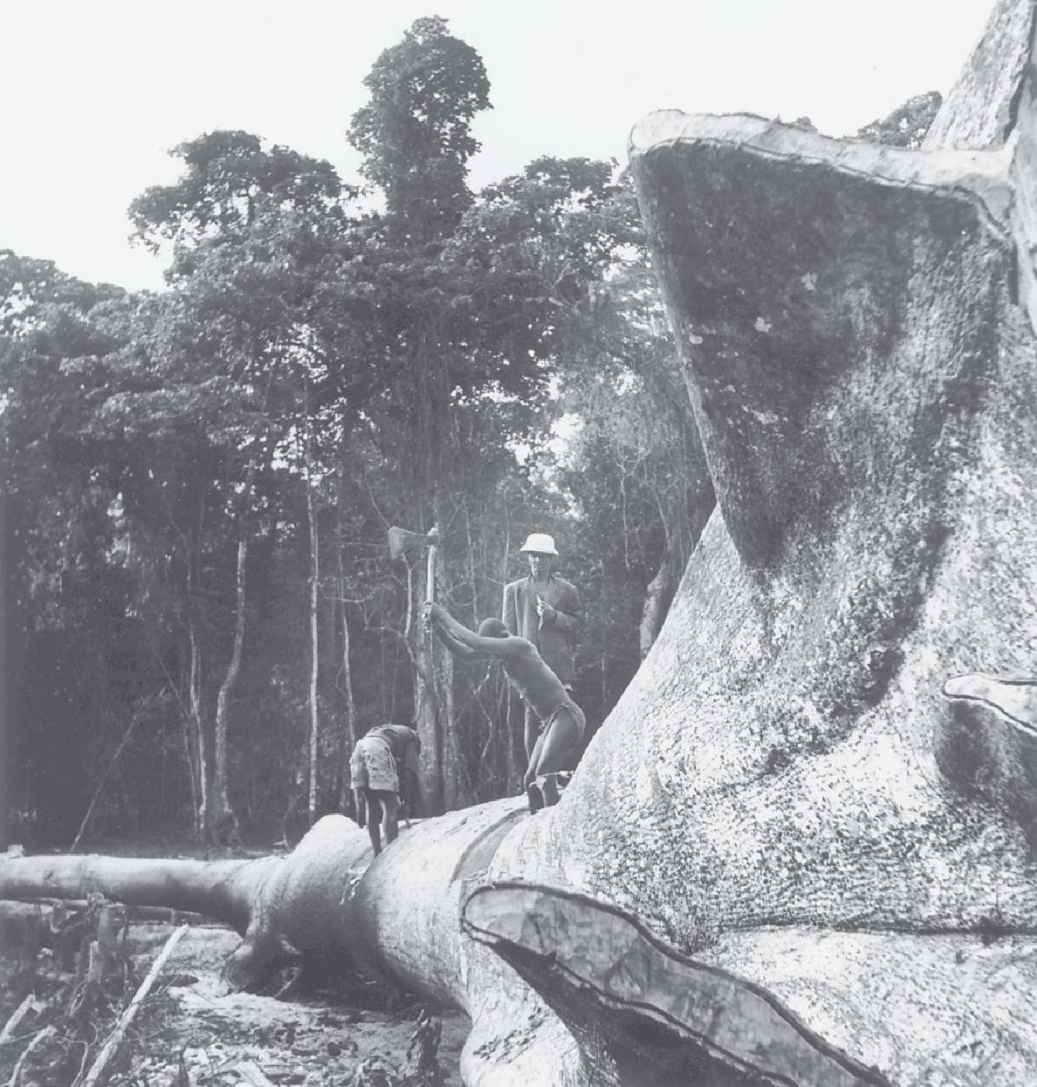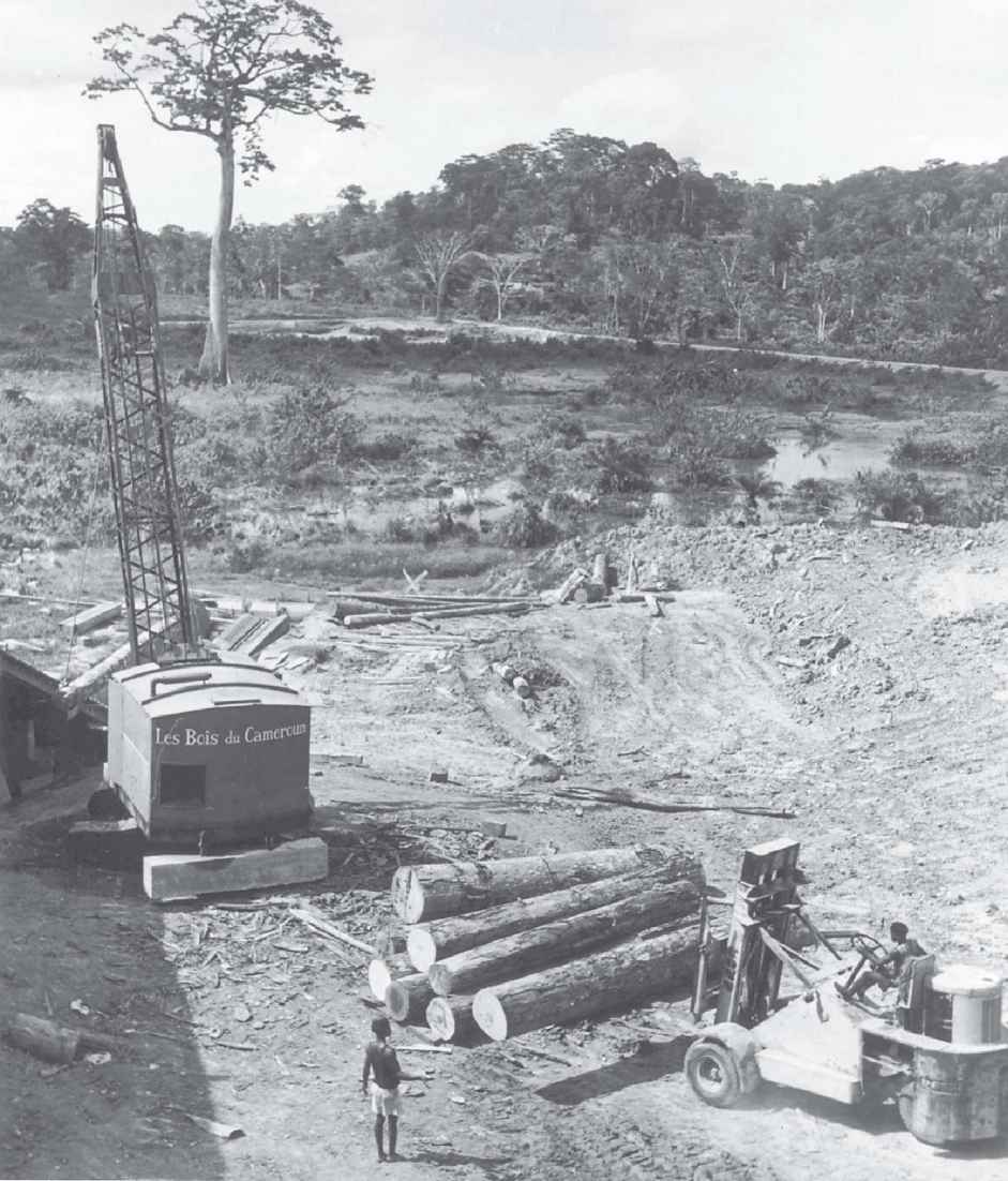 经由美国马歇尔计划提供重型设备给法国,殖民地时期非洲的伐木业效率突飞猛进。本图约在1950年摄于喀麦隆艾瑟卡(Eseka),当地有家法国公司从事木材出口。机械化伐木加上清空土地进行农耕,非洲西部雨林很快便在1950—1990年消失,是20世纪末热带雨林大灭绝的一部分