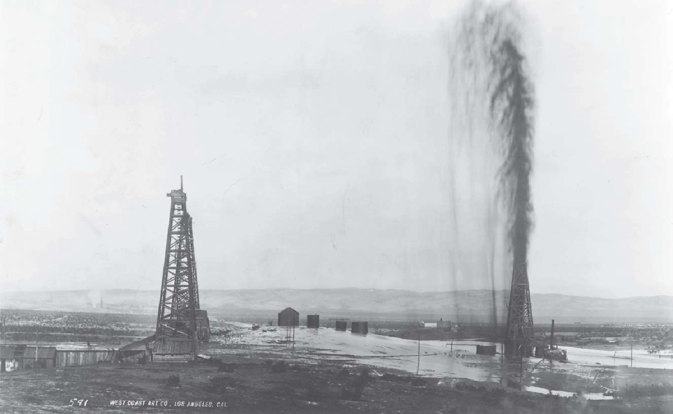 这是油商最爱的一幕,摄于南加州1910年左右的一个喷油井。随着20世纪初石油成为20世纪主要能源,油商们一夜暴富。一片兴奋的气氛下,很少有油商会去顾虑开采石油对景观的影响。抗议者像是瓦斯特克族与托托纳克族墨西哥印第安原住民,也无力阻止开采。早期的石油工业是肮脏的工作,无论在加州、墨西哥、俄罗斯或其他地方,但石油燃烧所制造的空气污染远低于煤炭