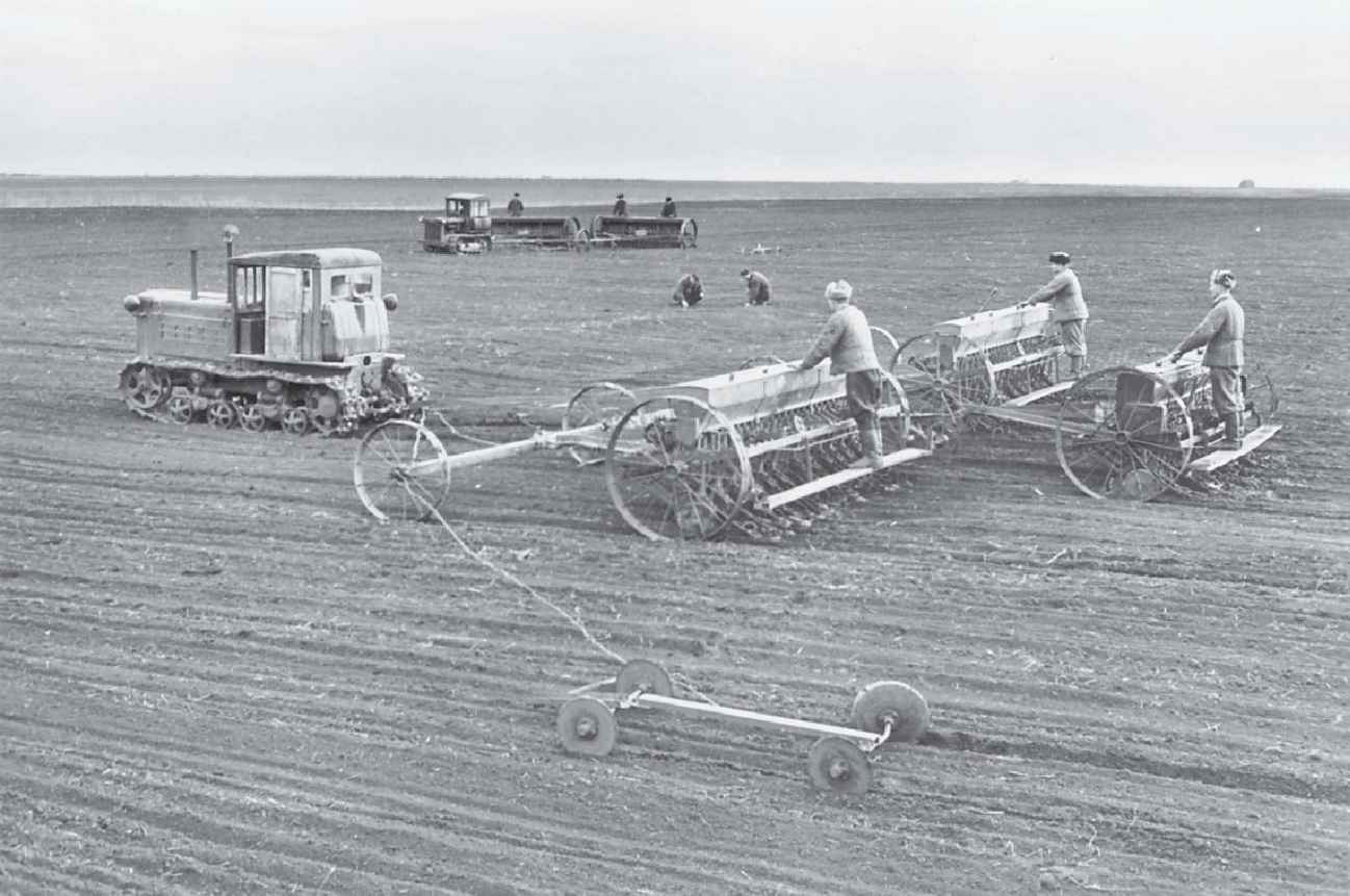 图为1955年苏联南部克拉斯诺达尔(Krasnodar)地区的列宁集体农场(Lenin Collective)。克拉斯诺达尔曾经是库班哥萨克人(Kuban Cossacks)的家乡,拥有肥沃的大草原土壤,是20世纪一大谷物产区。20世纪30年代苏联实施集体化农业后,机械化与意识形态的承诺结合起来,鼓励设立大型露天田地的农场,但这也因此相当容易受到风蚀影响。有坦克式履带的拖拉机在泥泞的田地上相当有用
