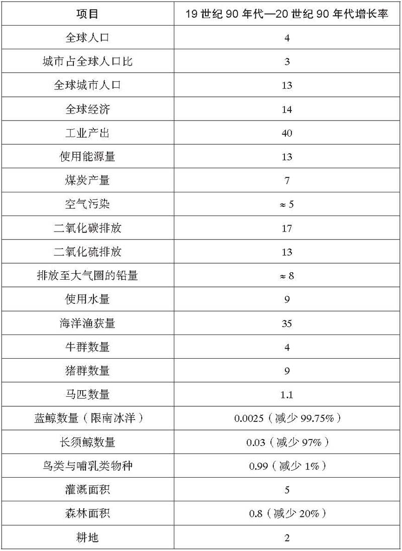 我预期未来会发生可怕的生态与社会问题,只是因为我看到了过去的历史。在本书中,我尝试以数字来呈现20世纪所历经的部分生态变迁。其中只有少部分能够转化为数字。这些数字都摘录在表11.1中,这是20世纪环境变迁与部分造成这些变迁因素的概略数据。这个表格忽略了只在1900年之后才扩张的现象,例如氯氟碳化合物的释放与拖拉机的数量。它忽略了若以1900年为基础,则增加率如同天文数字的扩张,例如全球汽车总数、化学肥料使用量,或是化学合成物产量的吨数。这个表格是个不完美的度量标准,但呈现的整体印象依然正确。