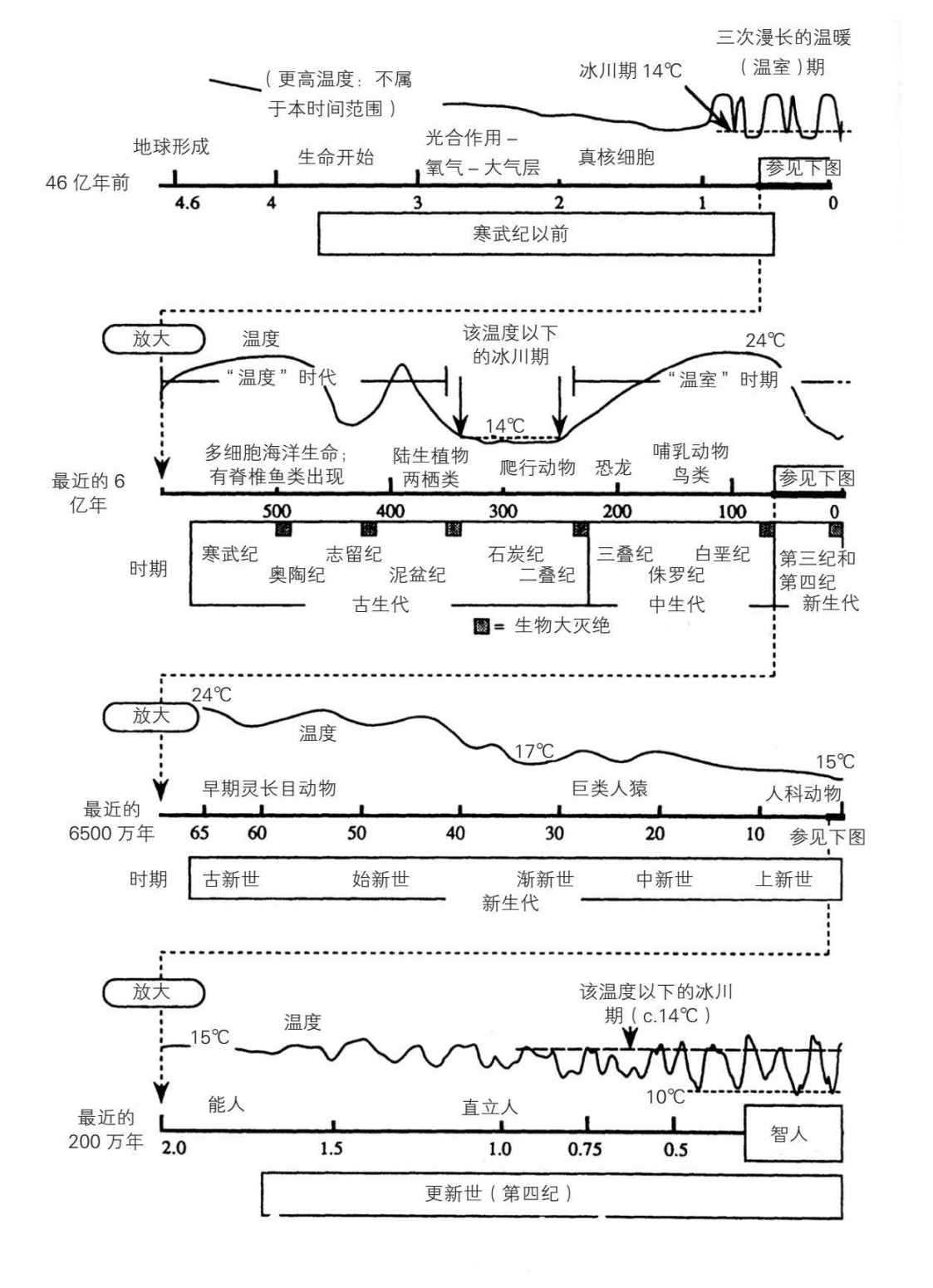 全球变暖并不是什么新鲜事。在整个地球历史上,地球的平均表面温度一直在几个不同的数值范围内波动。就像这些图像显示的,我们人类这个物种就是在地球变冷的周期内进化的。但是在最近的100万年里,温度的变化变得更不稳定,这段时期被称作冰川期。选自麦克迈克尔(A. J. McMichael):《危险的地球:全球环境变化和人类的健康》(剑桥:剑桥大学出版社,1993年),第27页。剑桥大学出版社惠允复制