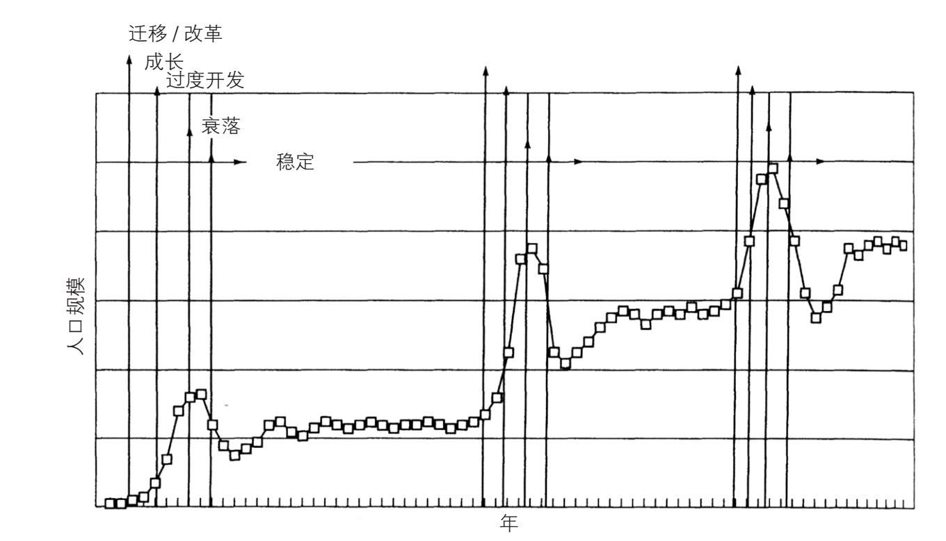 [48] 此种范型在澳大拉西亚(Australasia)的运作,在蒂姆·弗兰纳里的《未来食客:澳大拉西亚的土地和民族生态史》(新南威尔士,查茨伍德:里德出版社,1995年)各处中均有生动描述;摘要见第344页。MIGODS是迁移(Migration)、更新(Innovation)、增长(Growth)、过度开发(Overexploitation)、衰落(Decline)、稳定(Stabilization)六个英文词的第一个字母。——译者注