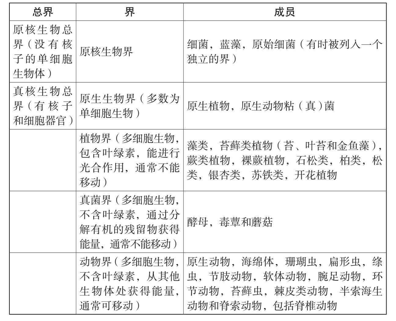 表5.1 五界分类摘要