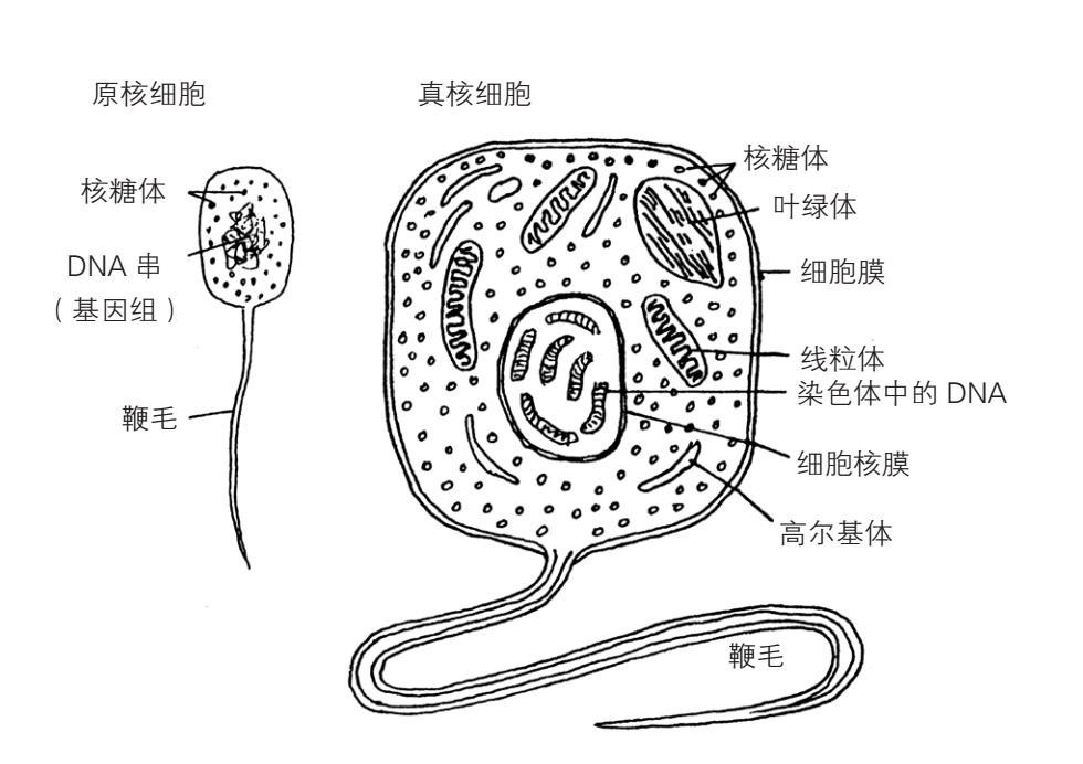 真核生物细胞要比原核生物细胞更大、更复杂。在所有的细胞里,核糖体在脱氧核糖核酸指导下集合了蛋白质。使得细胞能够移动的鞭毛,存在于许多(但不是所有)细胞中。但是真核生物细胞同样包含了原核生物细胞所不具有的其他结构(或者细胞器官)。真核生物细胞把它们的脱氧核糖核酸保持在一个特殊的领域(核子)中,在那里被特殊的膜所保护,通常被叫作染色体的特殊小包组织起来。它们也有线粒体,能够把食物转化为化学能量线粒体;许多还有叶绿体,能通过被称作光合作用的过程把光能转化为化学能量。最后,真核生物还有细胞骨架,这是一个由蛋白质纤维棒和管所构成的复杂结构,它把不同的细胞器官集中在细胞里。选自阿曼德·德尔塞默:《我们宇宙的起源:从大爆炸到生命和智慧的出现》(剑桥:剑桥大学出版社,1998年),第164页。剑桥大学出版社惠允复制