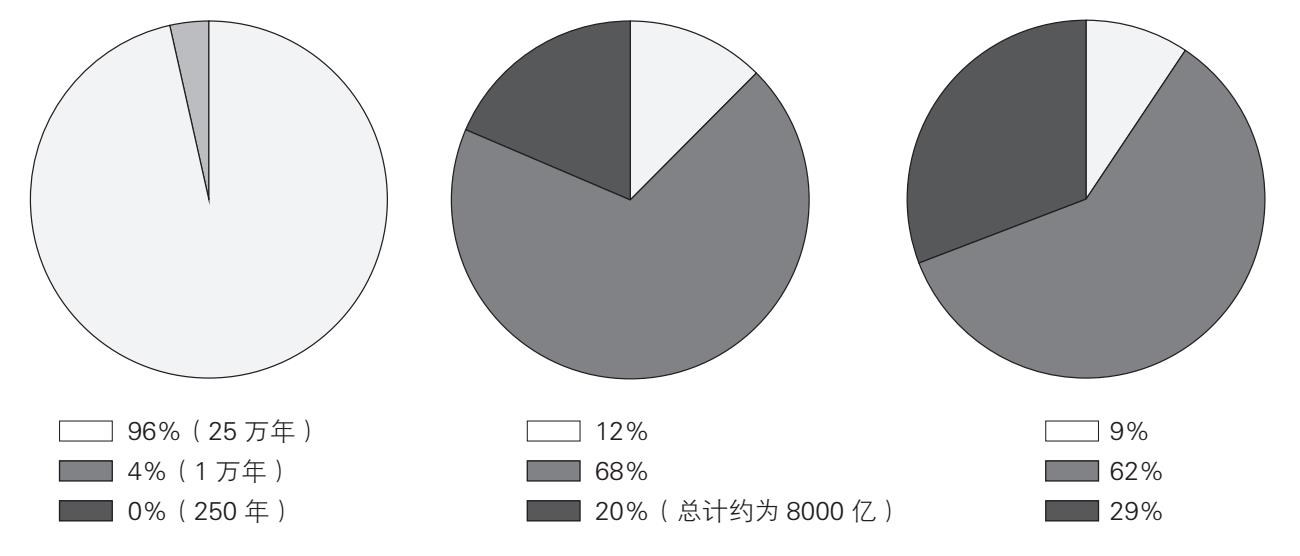 旧石器时代、农耕时代和新现代的比较,按照(a)延续时间(分别为24000、10000和200年)。(b)每个时代生活的人口数量[据利维——巴奇:《简明世界人口史》(牛津:布莱克韦尔,1992年),第31、33页,自人类出现以来,其人口总数大约为800亿]。(c)生活在每个时代的人类数量(据利维——巴奇:《简明世界人口史》,第31、33页)
