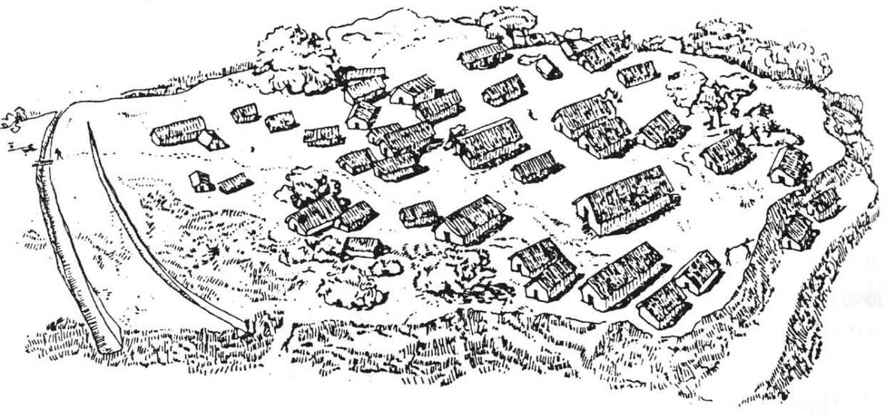 公元前第四个千年的克罗米契纳(Kolomiyshchina)村庄复原图。转引自玛丽亚·吉布塔斯(Marija Gimbutas),《女神的文明:古代欧洲世界》,琼·马尔勒(Joan Marler)主编(旧金山:哈珀与罗,1991年),第106页