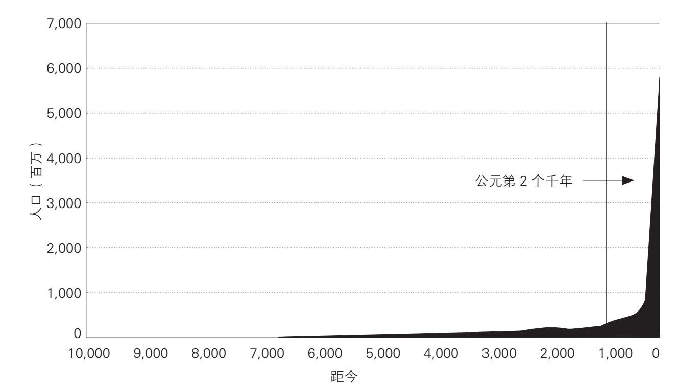 图8.2 人类的数量,距今1万年——当代(根据表6.2绘制)