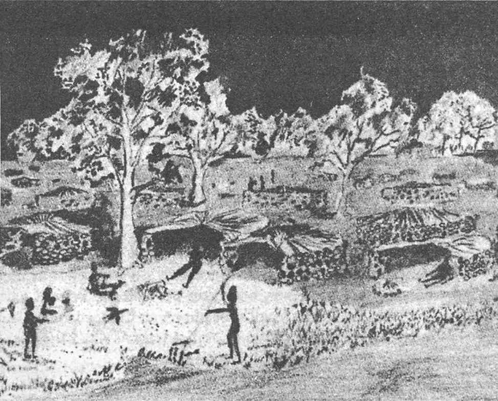 在维多利亚的孔达赫(Condah)湖畔发现140多座石头房子。采自约瑟芬·弗鲁德,《梦幻时代的考古学》(悉尼:柯林斯,1983年),第207页;艺术家的印象,戴维·怀特(David White)作,《年代》,29.1.81