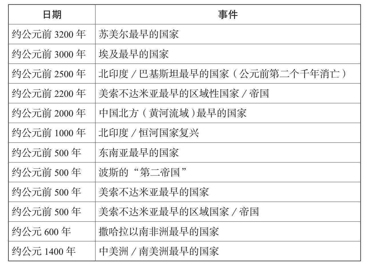 公元前3000年,在美索不达米亚南部以及沿尼罗河出现的农耕文明是绝无仅有的;虽然人口众多,但是仅占当时整个人类的极小一部分。大多数人仍然生活在没有国家的共同体里。4000年以后,公元1000年,农耕文明所能控制的地域,仍只不足地球表面的1/5,但是从其他方面看,它们已经成为占主导地位的共同体。在非洲—欧亚大陆的许多地区和美洲部分地区都能够找到它们的身影。在太平洋地区甚至还存在小型的原始国家。(参见表10.1)