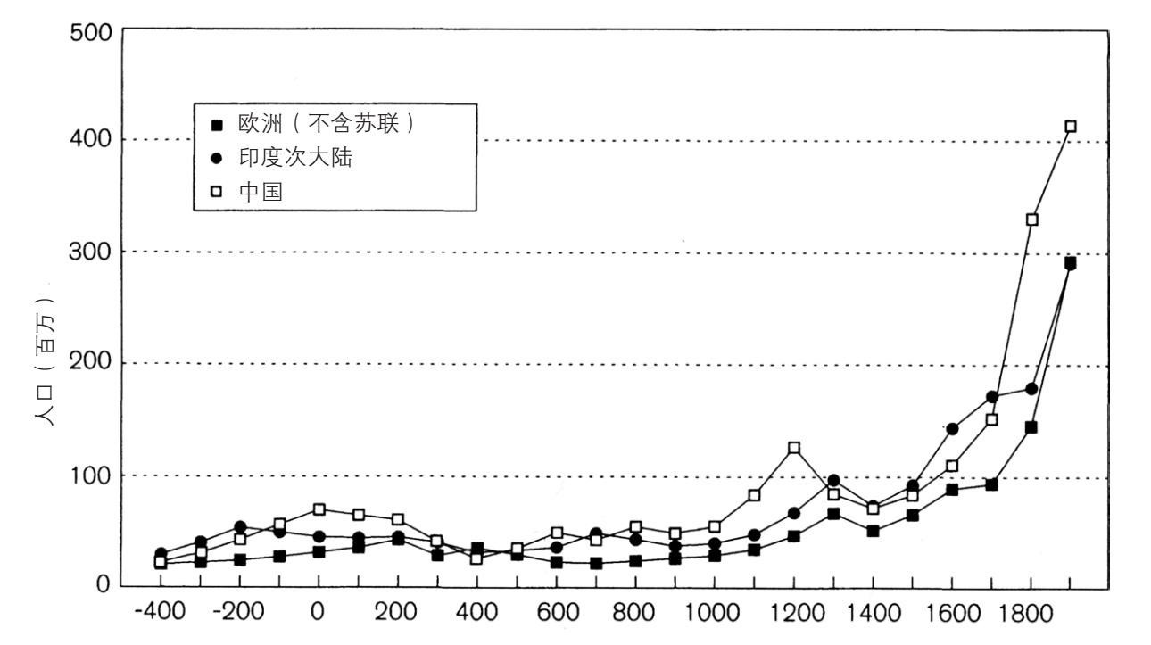 图10.4 公元前400——公元1900年中国、印度和欧洲的马尔萨斯循环该图表明,马尔萨斯的人口增长模型,不时为突然下降所打断,这是农耕文明特有的历史。转引自J. R. 比拉本,《人口数量的进化》,载于《人口》第34号(1997年),第16页