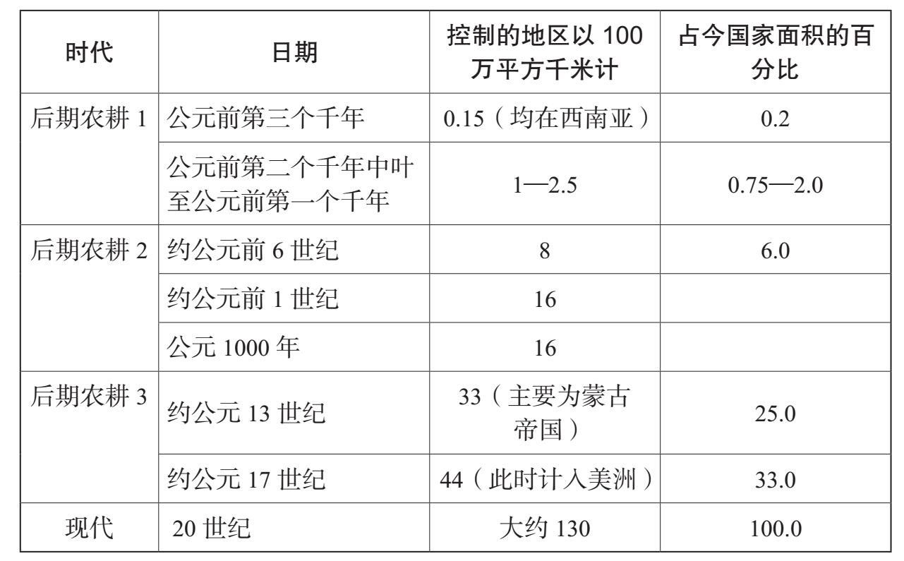 有三个时代特别突出。第一个时代从公元前第三个千年到公元前第一个千年中叶。在这一时期,农耕文明仅存于非洲—欧亚地区,而它们直接控制了当今国家体系所统治地区的2%。第二个时代始于公元前第一个千年中叶,当时出现了阿黑门尼德帝国,一直延续到公元1000年。到这个时代结束的时候,农耕文明控制了现代国家控制地区的6%——13%。在这个时期,农耕文明在美洲也有所传播,但是它们所控制的地区比非洲—欧亚大陆农耕文明所控制的面积要小得多。随着蒙古帝国以及过去500年欧洲帝国的兴起,在公元1000年以后,大帝国的统治面积陡然增长。美洲帝国在公元1000年后也有所扩张,但是它们对这种增长的贡献极小。在1500年,印加帝国统治了大约20万平方千米的疆域,而阿兹特克仅有2.2万平方千米。即使将夏威夷和汤加还在襁褓中的国家形式的地区包括进来,对于这些数据也不会造成实质性的差异。[30]