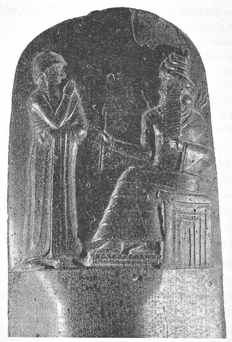 汉谟拉比于公元前1792——公元前1750年统治巴比伦。他是第一个有详尽的法律流传至今的统治者。玄武岩柱高达两米,镌刻着他的法律,由1901年法国考古学家发掘出土;今存巴黎卢浮宫。这部分石柱表现了太阳神赐予汉谟拉比象征职权的权杖和指环