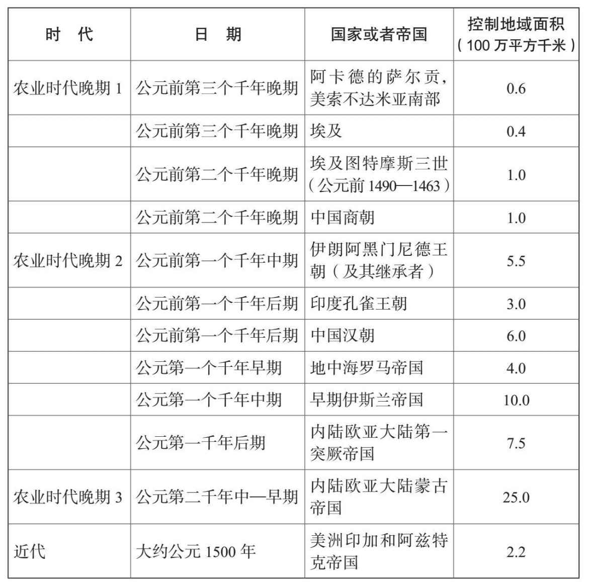资料来源:威廉·埃克哈特,《文明、帝国和战争的辩证进化》,载于《文明和世界体系:研究世界历史变迁》,斯蒂芬·K. 桑德森(Stephen K. Sanderson)主编(沃尔努特·克里克:埃尔塔米拉出版社:1995年),第79—82页,主要取材于莱因·塔加帕拉,《帝国的规模和延续性:规模的系统化》,载于《社会科学研究》,第7卷(1978年):第108—127页