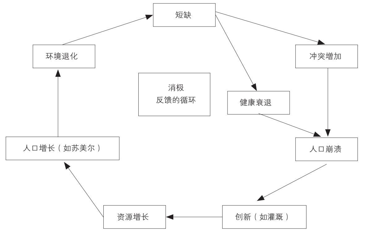 对于一般农耕文明而言,近代早期法国的情况也是一样的。为了对勒华·拉杜里所描述的循环有些感性认识,我们考察一下不同地区农耕文明人口增长的情况也许不无裨益。图10.4将J. R. 比拉本研究的公元前400——公元1900年中国、印度次大陆以及欧洲人口的大致数据用图表加以表示。[34]很明显,在每一个地区都有一个周期,人口增长了之后就会衰落——有时甚至是剧烈的衰落。我们如何解释这些似乎决定了农耕文明的各地区中期历史的节律呢?虽然它们将人口发展的若干种趋势混合在了一起,如收成波动、战争以及商业和国家政治等,但是有一些因素是决定性的:与创新(尤其是农业创新)、人口增长、生态退化、健康衰退以及冲突增加等否定的反馈循环,导致了人口的衰落(参见图10.5)。