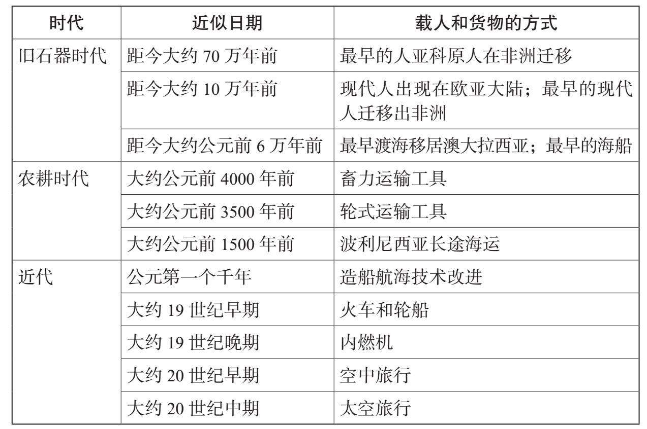 在交通运输方面的技术交流也使得创新能够更为迅速和广泛地传播(参见表10.3和10.4)。次级产品的革命对于非洲—欧亚大陆区的交换速度和密度的增长也是至关重要的,就像它早在公元前4000年就促使诞生了新形式的运输工具一样。牛、驴和马的轭也刺激了轮式运输的革命。在海上,当欧洲在获得了波利尼西亚航海家的技术后,他们航海的速度、安全性以及准确性无疑大为改进。通衢大道的修建也刺激了从中国到罗马的交通。交通方式的进步与文字和书写方法的改进也有关联。但是某些帝国,包括阿黑门尼德和汉朝组织了长途捷运系统(印加和以后的秘鲁也是如此)。许多社会还构建了基于烽火台的早期预警系统,以便信息有时能够长距离快速传递。
