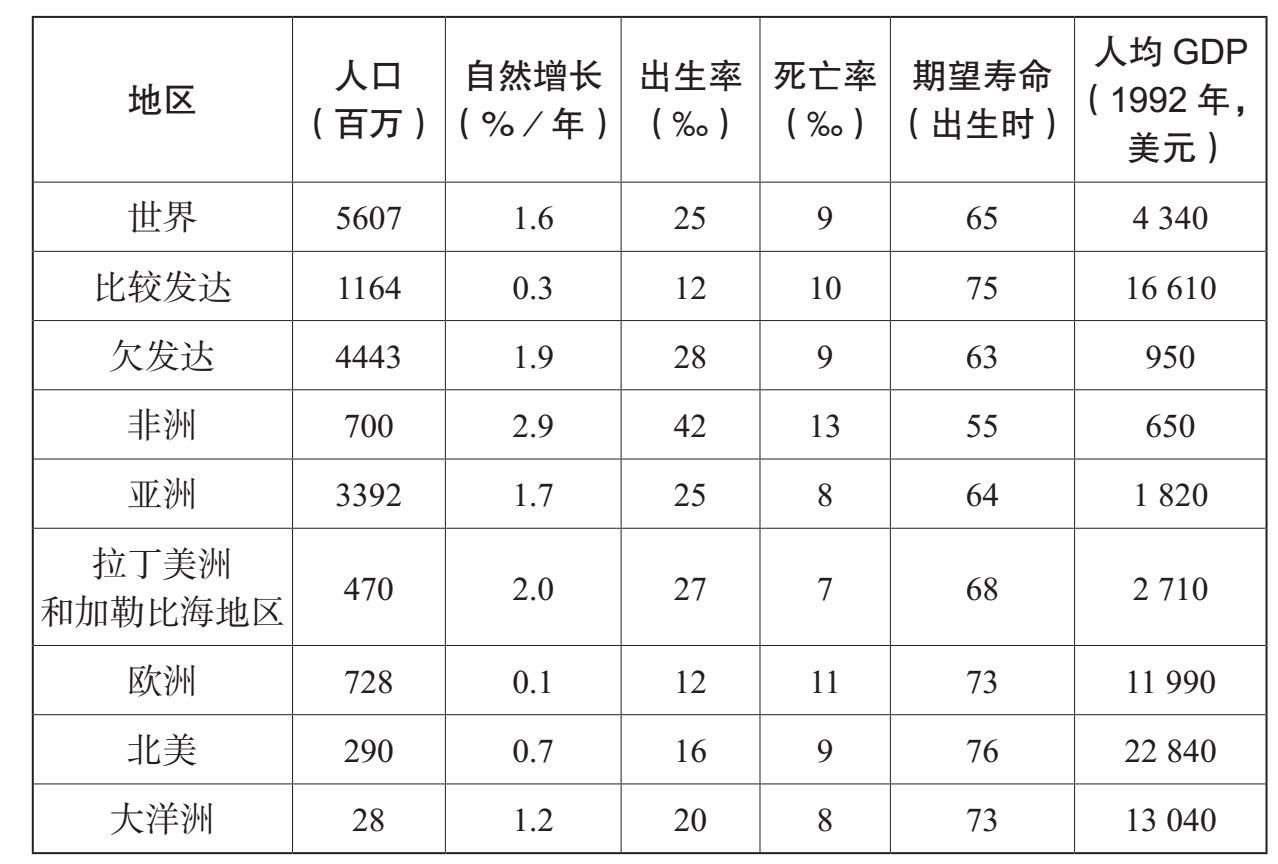资料来源:艾伦·芬德利(Allen Findlay),《人口危机:马尔萨斯幽灵?》载于《全球变迁的地理学:重绘20世纪末的世界地图》,R. J. 约翰斯通、彼得·J. 泰勒和迈克尔·J. 沃茨(牛津:布莱克韦尔,1995年),据《1994年世界人口资料表》绘制,华盛顿特区人口资料局编