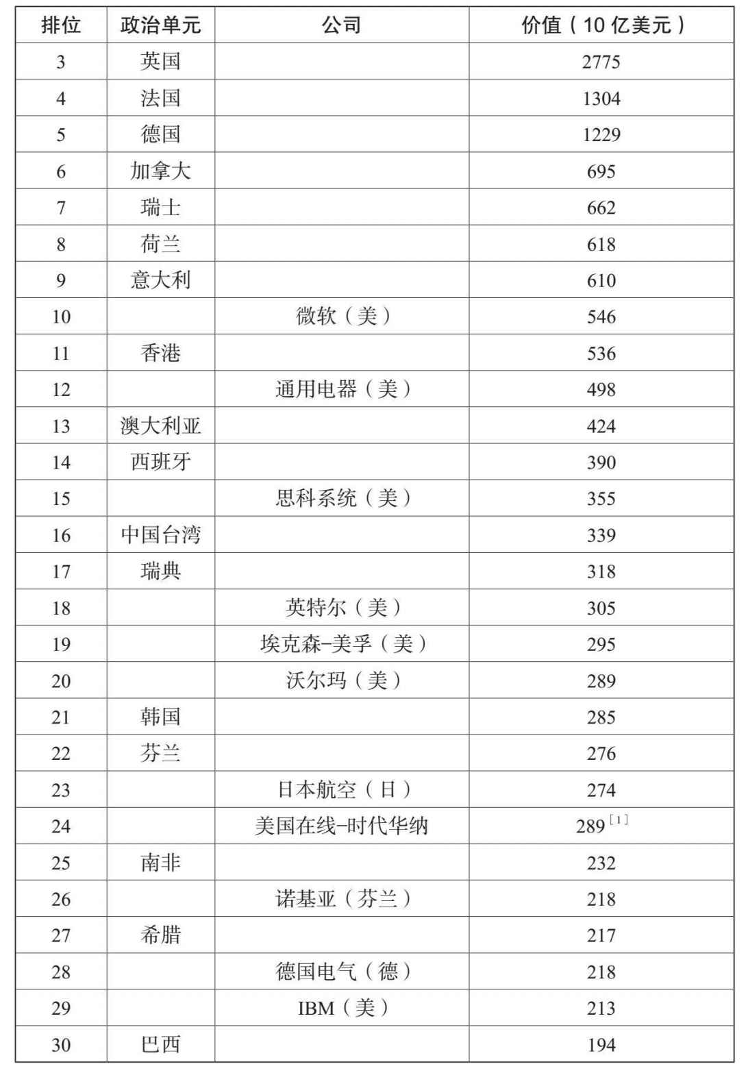 接着在第六次浪潮中,经济增长再一次得到提速。这一浪潮直到现在的21世纪初仍是汹涌澎湃。其主导技术就是电子技术和遗传学,而其早期最惊人的影响就是将世界各部分比从前更加紧密地联系在一起了。曼努埃尔·卡斯特尔斯(Manuel Castells)论证到,20世纪最后20年资本主义的历史发展到了一个他称之为“信息时代”的新阶段。[11]他主张,在这个阶段的信息流是获取利润的关键;个人与企业的界限被抹杀了,因为生产和服务通过不断改变企业联盟或者网络而组织起来,许多企业将其工作分包给个人或者小型公司。信息的控制和运动也许变成了唯一一个最大的工业部门。[12]全球的信息和财富的流动变得如此之快,毫不在乎传统的界限,以至于它们模糊了国家与国家、企业与企业之间的界限。在2000年,许多跨国公司的市场价值与许多大国等值,而这些大型联合企业都是与通信相关(参见表14.2)的。