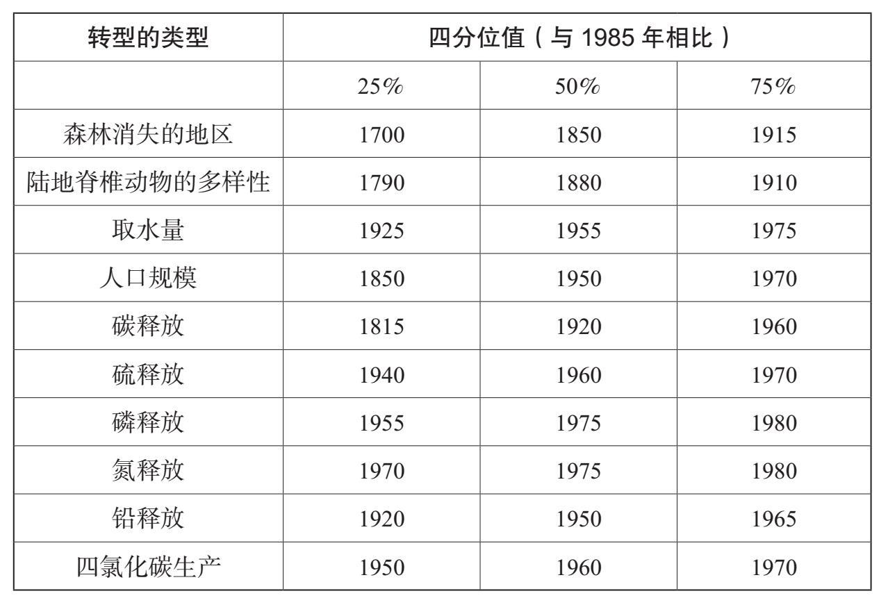 资料来源:罗伯特·W. 凯茨、B. L. 特纳二世和威廉·C. 克拉克,《大转型》,载于《人类行为造成的地球变化:过去300年生物圈的全球性和区域性变化》,B·L·特纳二世等主编(剑桥:剑桥大学出版社,1990年),第7页