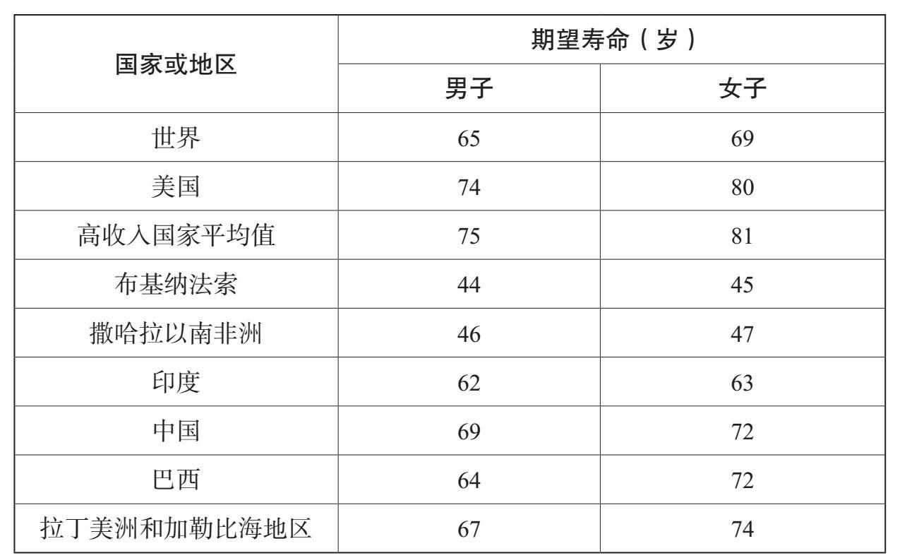 虽然我们衡量这些不平等的尝试是粗略的、近似的,但是仍然清楚表明某些趋势。全球人均收入表明,该指标从1900年的1500美元增加到1998年的6600美元。在此同一阶段里,全球预期寿命——生活幸福的最重要指标,从大约35岁增加到大约66岁。[17]这些都是意义重大的成就,但是正如表14.3和表14.4所示,它们的分布却是不均衡的。美国2000年国民人均收入大约为34 100美元(而最高收入国家平均27 680美元),但是巴西的国民人均收入大约为3580美元,而中国(200年前的经济超级大国)仅为840美元,印度(另一个前经济巨人)和布基纳法索则分别为450美元和210美元。而比率则使这些差异变得更加惊人(参见表14.3)。这些数字表明布基纳法索的国民人均收入不到最高收入国家平均值的1%,而印度和整个撒哈拉以南非洲仅及平均值的1.5%。当然预期寿命统计的比率不那么极端,现代医疗知识提高了全世界的预期寿命。尽管如此,统计数字清楚表明相对贫困缩短了寿命(参见表14.4)。