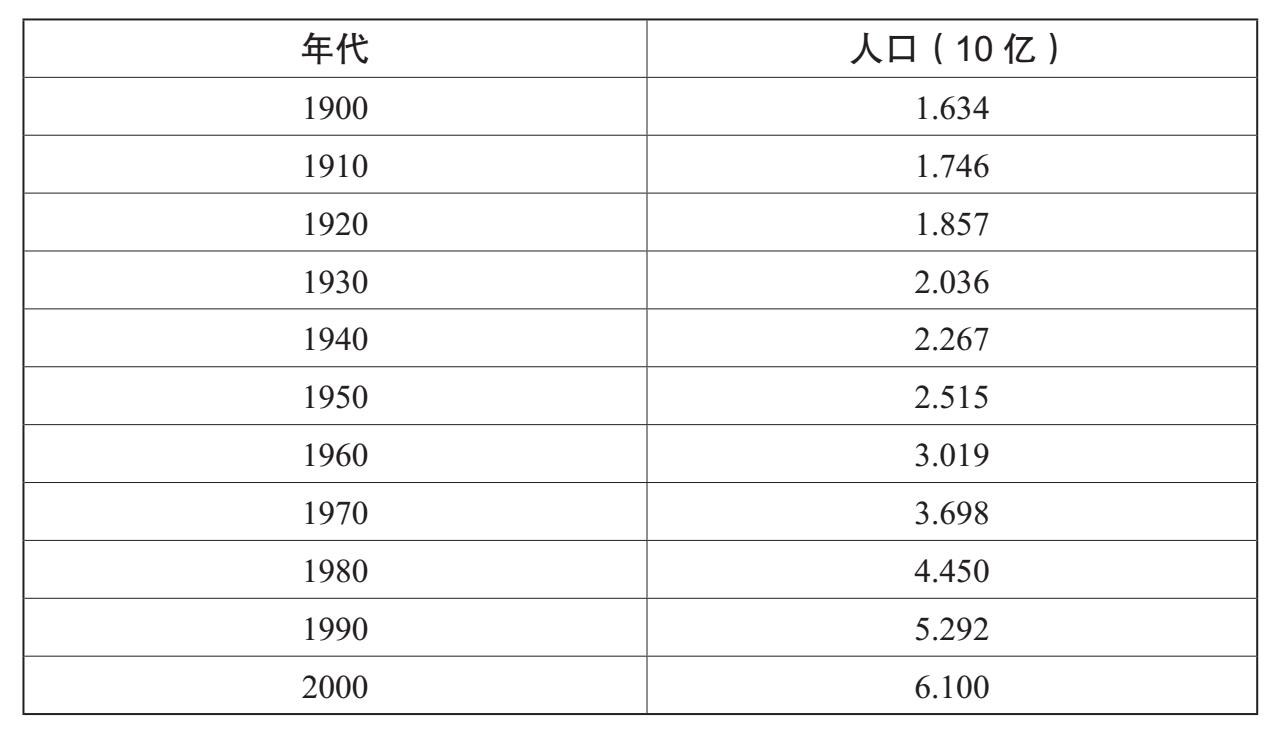 为了描述这些变迁,从人口增长开始还是能够说明问题的,因为不管其他因素,如新技术和新的社会组织形式究竟发生怎样的影响,每一次人口增长都不可避免对地球资源提出新的要求(参见图14.1)。[7]在1900年,世界人口维持在16亿。一个世纪后竟翻了近两番,达到将近60亿。人类首次达到10亿人口,用了将近10万年时间,而另外5个10亿仅仅用了一个世纪。在这个世纪里,人口翻番的时间,在上半世纪需要80年,而到下半世纪却只需40年就足够了。