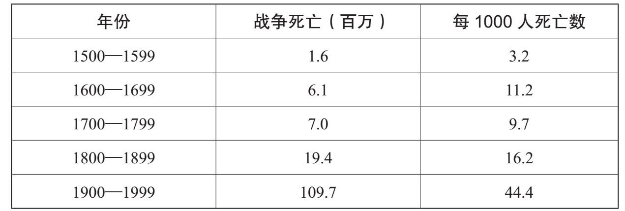 一个如此不稳定的、不平等的梯度日增的世界陷入各种冲突,是不足为奇的。过去100年经历的暴力冲突比人类史上任何一个世纪都多。人员和物资因为战争而遭受损失的规模反映了军队和武器的“生产力”以及投战争的军队和人力在现代逐渐增长。威廉·埃克哈特(William Eckhardt)粗略统计,在截至公元1500年的战争中,大约有370万人死于战争。