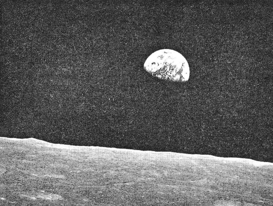 这张著名的照片于1968年12月摄于阿波罗8号宇宙飞船。这成为我们逐渐意识到人类的统一性和脆弱性的有力象征。威廉·安德斯(William Anders)当时是执行此次飞行的三名宇航员之一,可能实际上就是他拍摄了这张照片。1998年,他在一次采访中说:“从月亮看地球,看到的各种景象都会导致人类、其政治领袖、环境领袖以及公民认识到,我们真的拥挤在一个晶莹透彻的小星球上,我们应当善待它,也应当善待我们自己,否则我们就不能长久地待在这里。”正如弗雷德·施皮尔所指出的那样,地球升起的图片还提供了人类描述现实的脆弱性的反讽式象征,因为究竟是谁、什么时候拍摄的这张照片,三名宇航员的说法实际上是自相矛盾的。[弗雷德·施皮尔,《阿波罗8号地球升起照片》,2000,http: //www.i20.uva.Nl/inhoud/gig/Apollo%208%20US. pdf(accesed April 2003)]。该照片获美国宇航局惠允使用