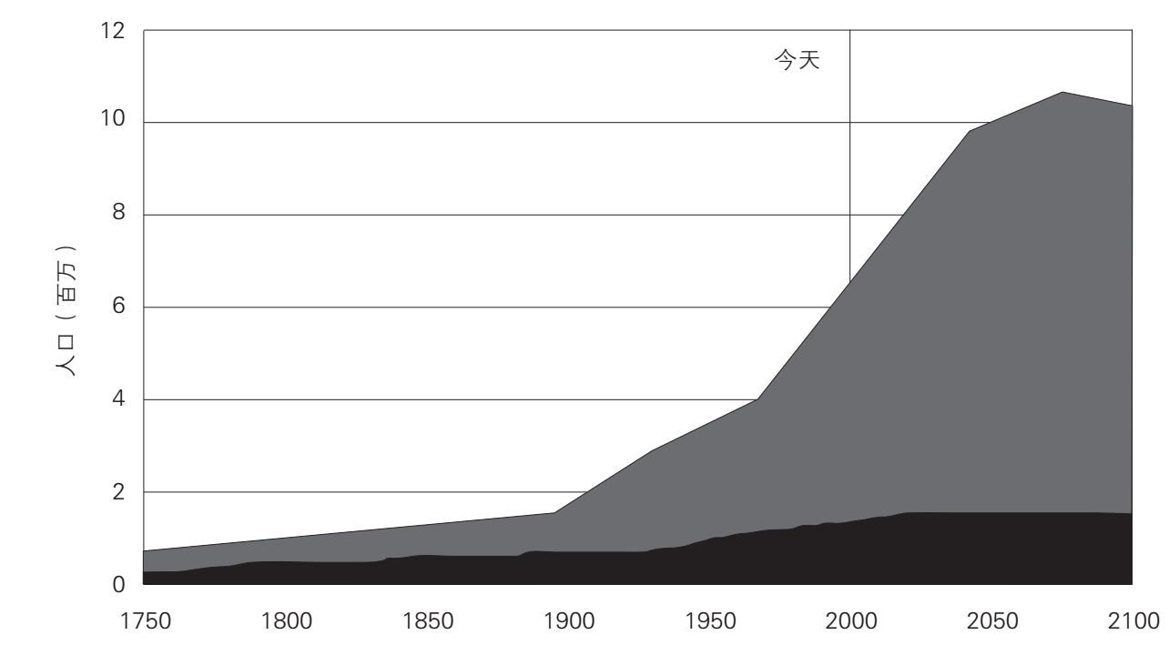 该图包含对发展中国家和发达国家未来人口增长的估计。如今,大多数人口学家一致同意最近两个世纪人口急剧增长将有所放缓,世界人口应在2100年达到稳定。但是,正如此图所示,在一定时期内,在那些最无力养活大量人口的地区,人口仍将继续增长。采自保罗·肯尼迪,《为21世纪做准备》(伦敦:丰塔纳,1994年),第23页